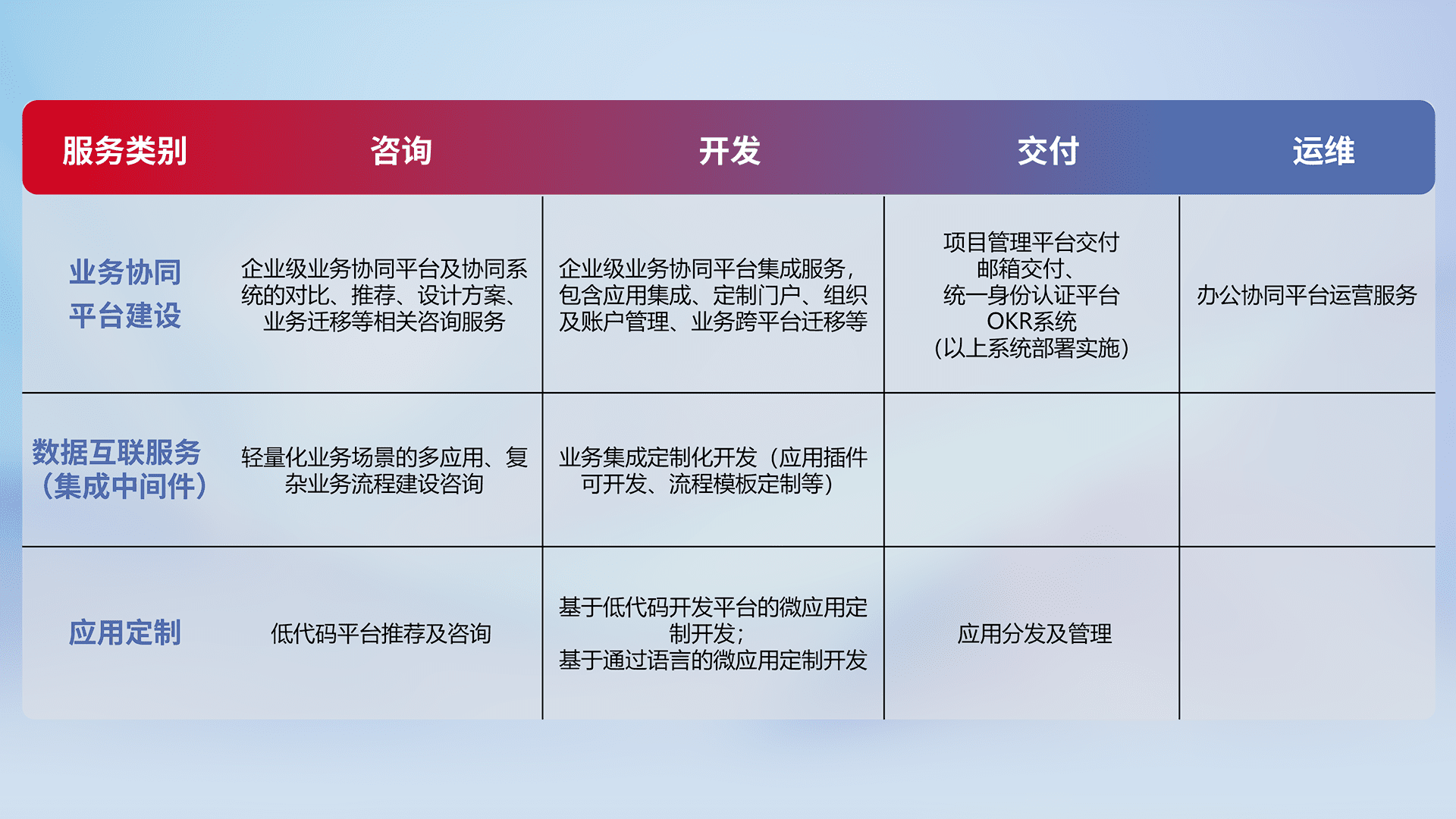 针对钉钉、、、、企微、、、、IDaas等平台级产品提供产品的规划、、方案、、交付、、、定制化开发等服务,,,实现如统一协同办公、、智能客户服务、、、、混合会议管理、、智能数据查询、、等业务场景,,,实现数字化转型。。。