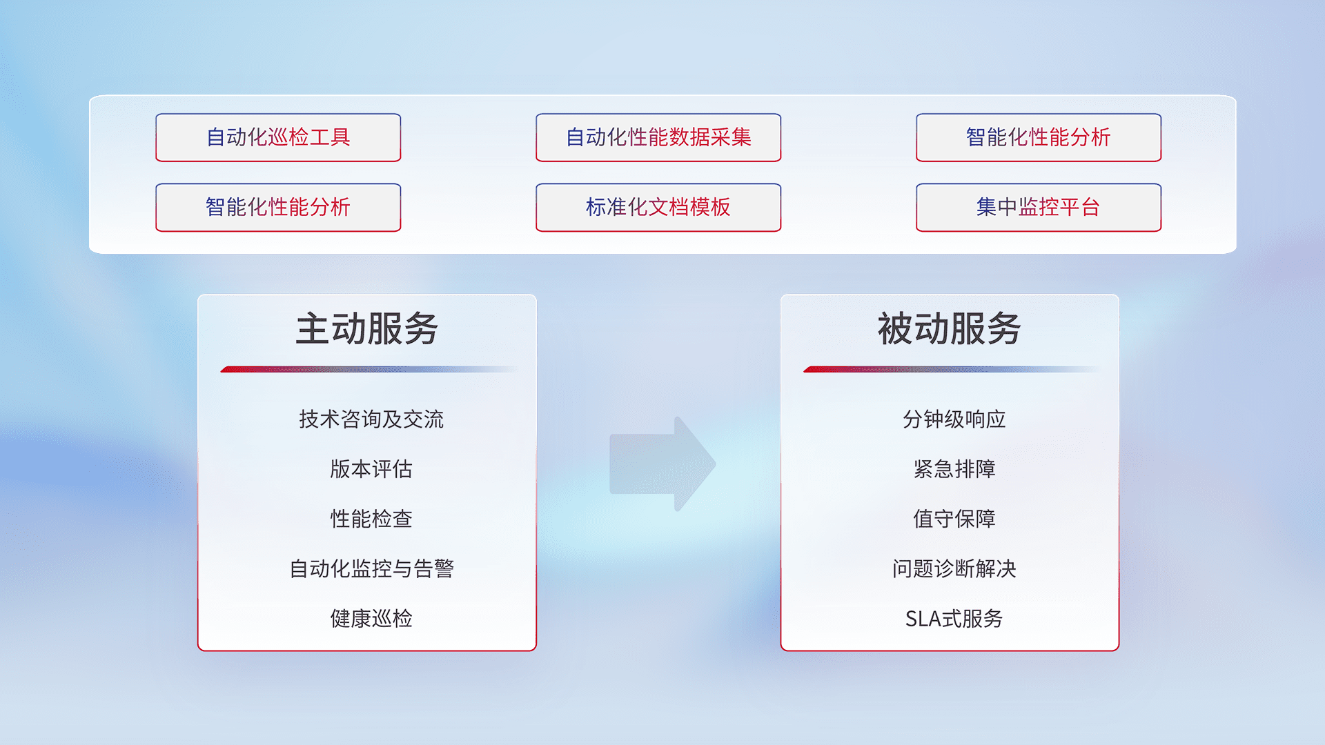 智能化工具和标准化文档,,,,保障服务质量,,,,提供主动服务(包含技术咨询、、版本评估、、性能检查、、、自动化监控与告警、、、、健康巡检)和被动服务包含(分钟级响应、、、、紧急排障、、值守保障、、、问题诊断解决、、、、SLA服务)。。。。