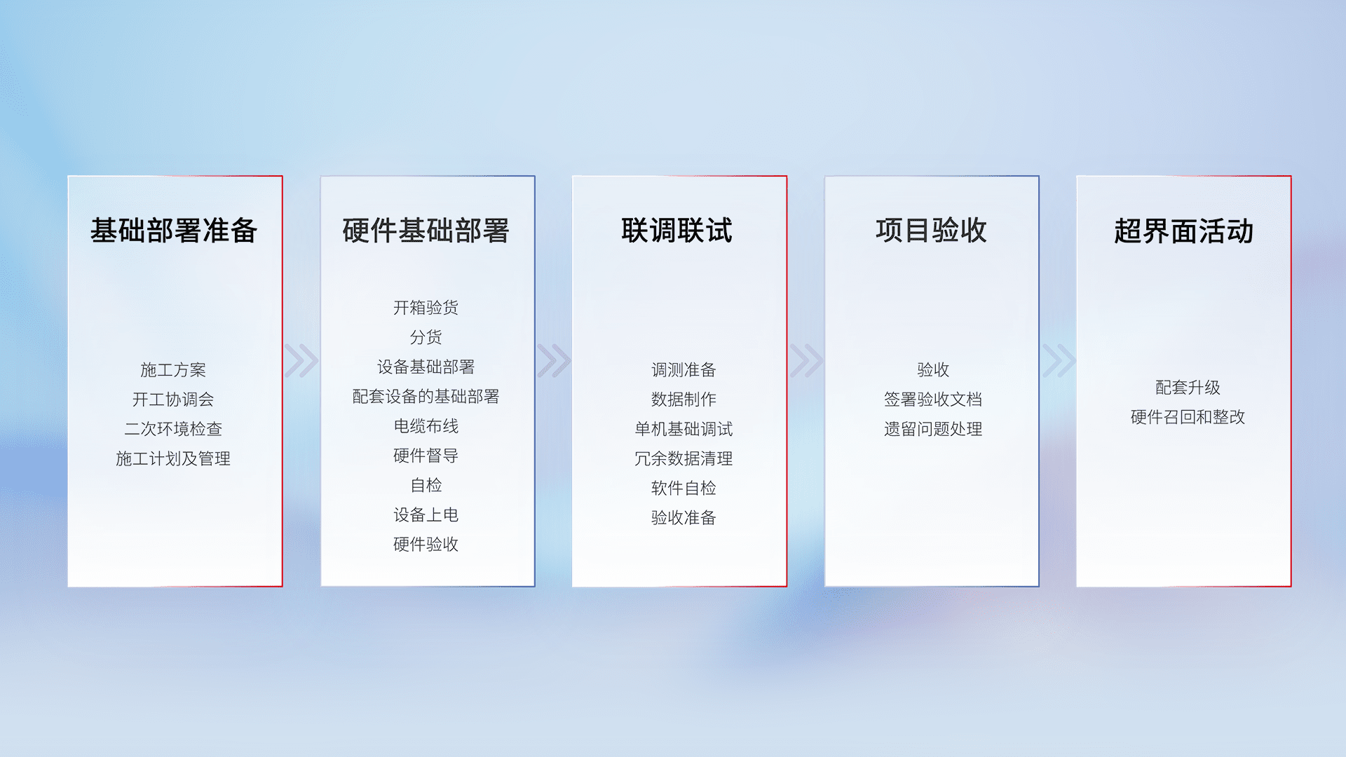 从基础部署准备、、硬件基础部署、、联调联试、、、项目验收、、、、越界面活动的全过程可追溯,,,保证施工质量和进度。。。